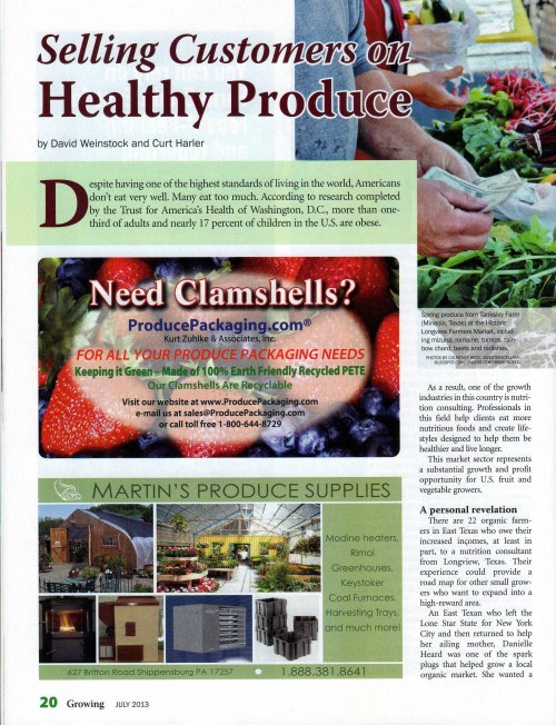 We are very honored to have had the opportunity to be interviewed and featured in Growing magazine in the article titled "Selling Customers on Healthy Produce." The article focus is on the health of Americans and the growing market for fresh, local and sustainable (ie organic quality) food. If you would like to read the article online, which appears on pages 20-24 of the magazine, click here. You can also read and print the article by clicking on the following pdfs: page 1, page 2, page 3, page 4, page 5, page 6.