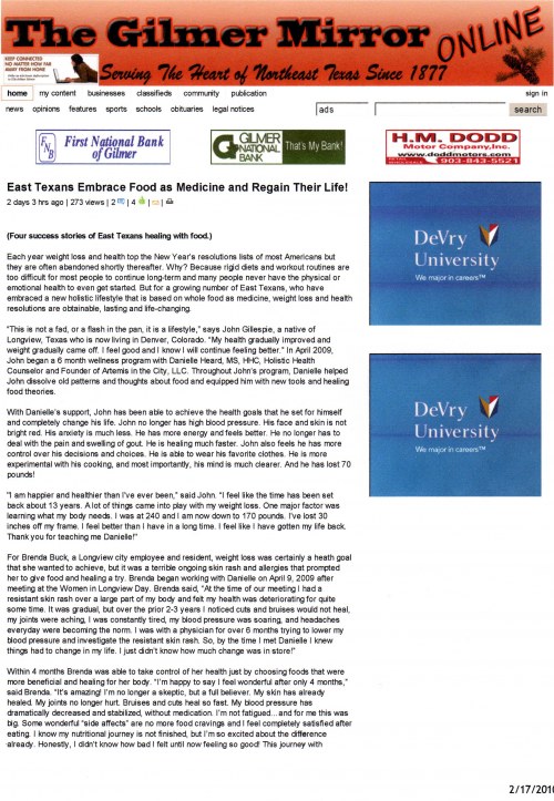 On Wednesday, February 17, 2010, Danielle Heard, MS, HHC, of Artemis in the City was featured in an article titled "East Texans Embrace Food as Medicine and Regain Their Life," in The Gilmer Mirror newspaper.