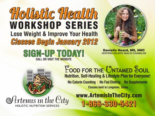 LONGVIEW, TX – December 19, 2011 – Beginning January 2012, Artemis in the City, LLC, will launch a new holistic health and nutrition workshop series in East Texas titled “Food for the Untamed Soul” Nutrition, Self-Healing & Lifestyle Plan for Everyone!